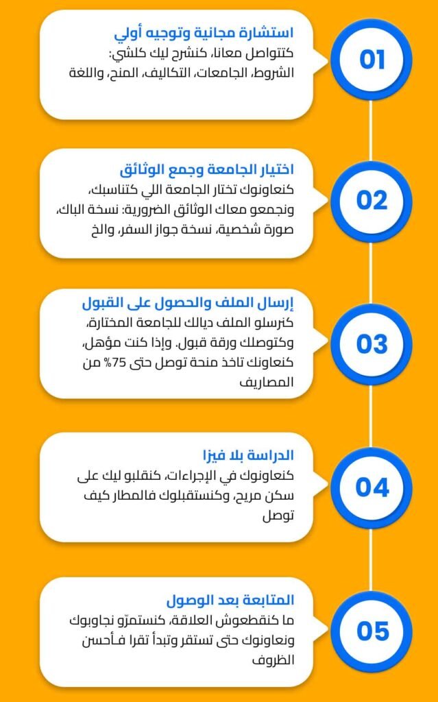 استشارات مجانية، استقبال من المطار، مرافقة شخصية، منح دراسية، ودعم مستمر 24/7.